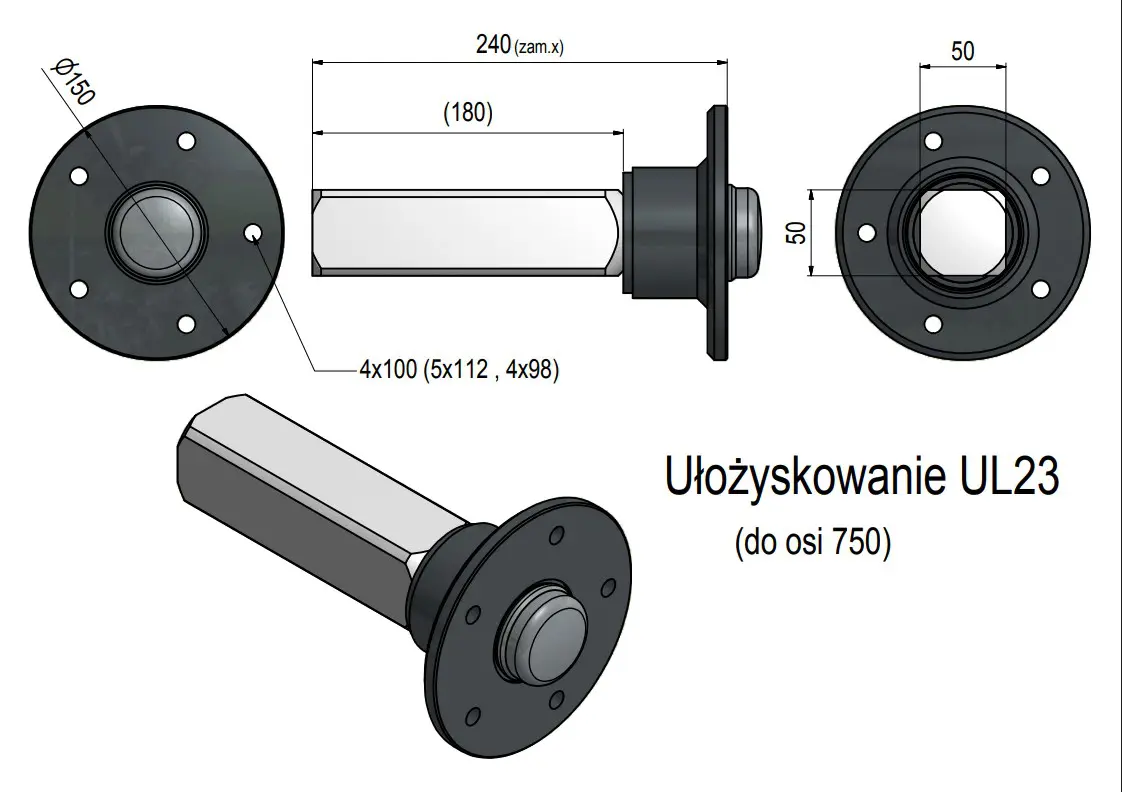 Piasta z czopem kompletna 750kg 4×100 50×50