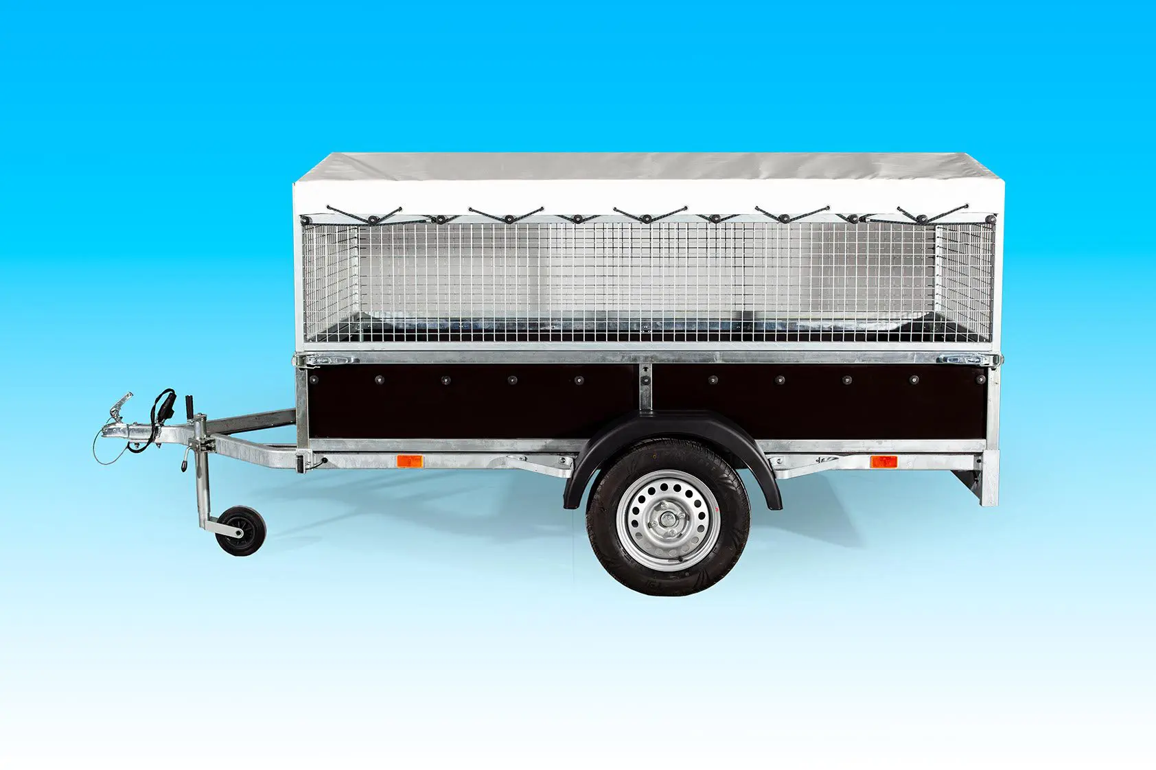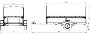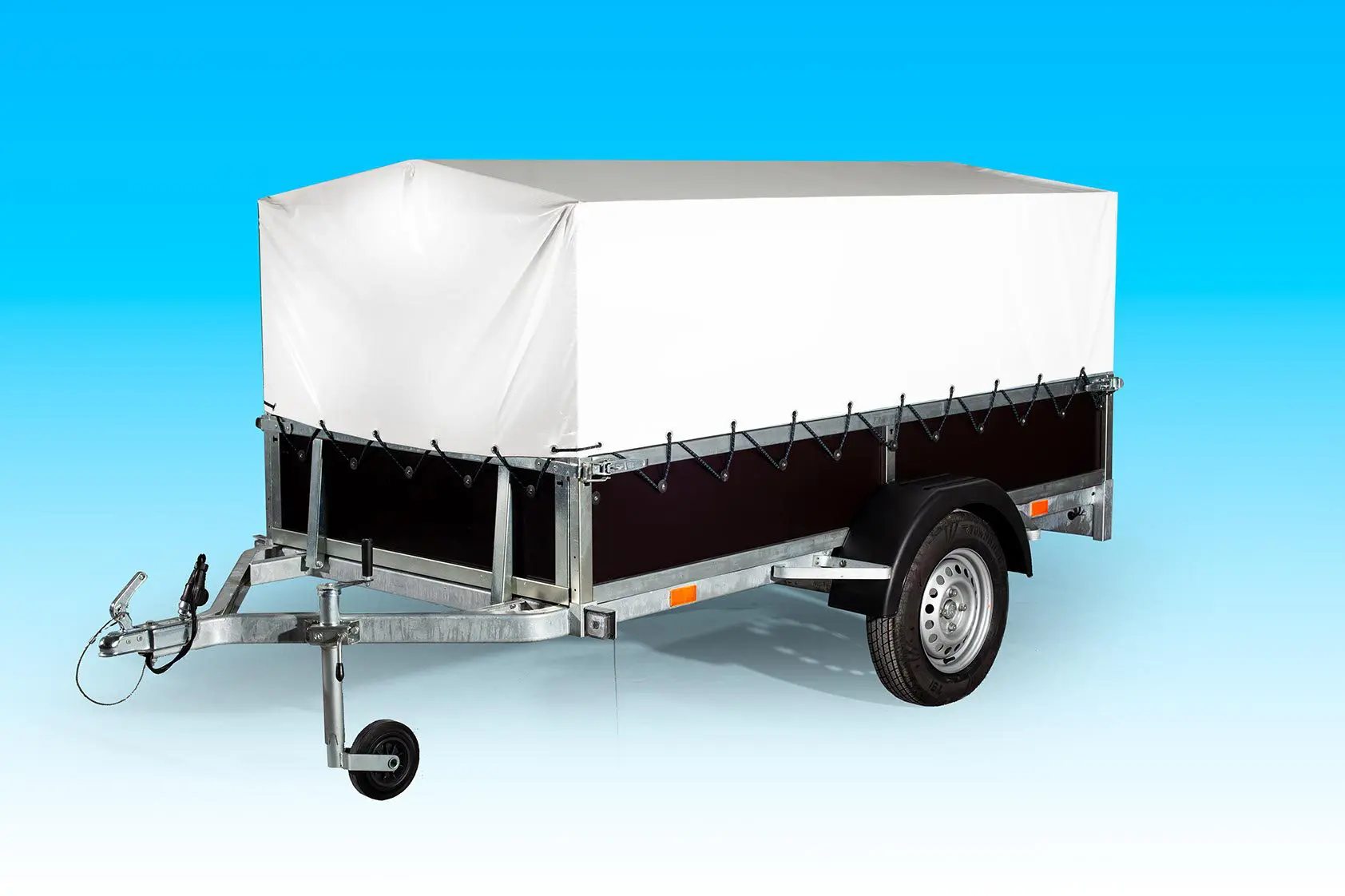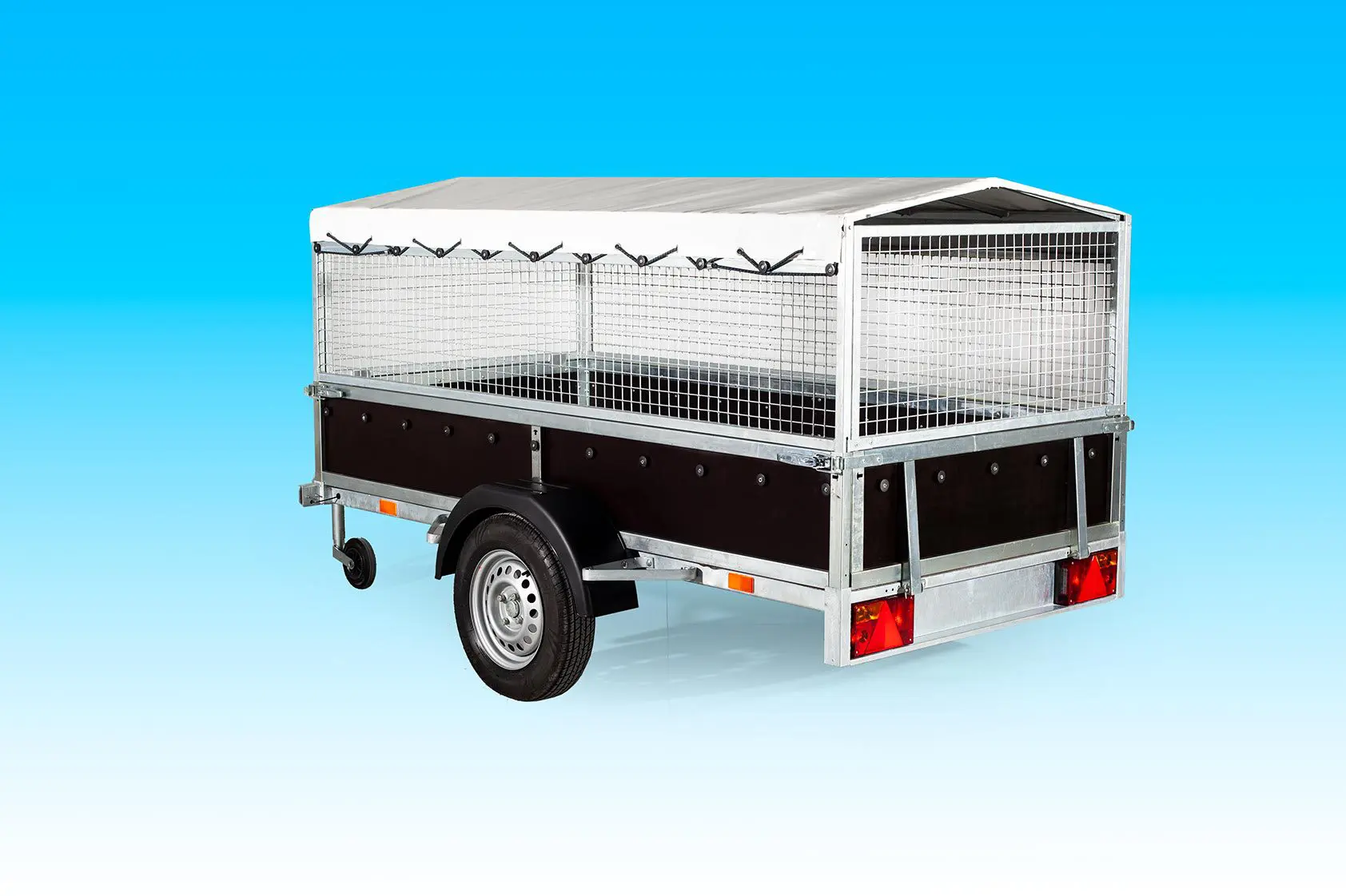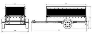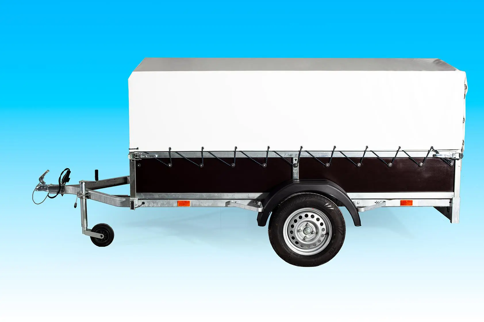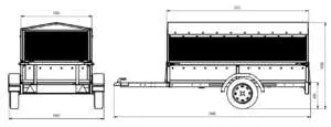 SYRIUSZ PÓŁPLANDEKA (PP). Konstrukcja skrzyniowa o parametrach jak w opisie Syriusz SK, lecz posiada dodatkowo daszek pokryty pół plandeką. Wys. całkowita przyczepy to 1560 mm. Kolor daszku może być biały, niebieski, popielaty, zielony.